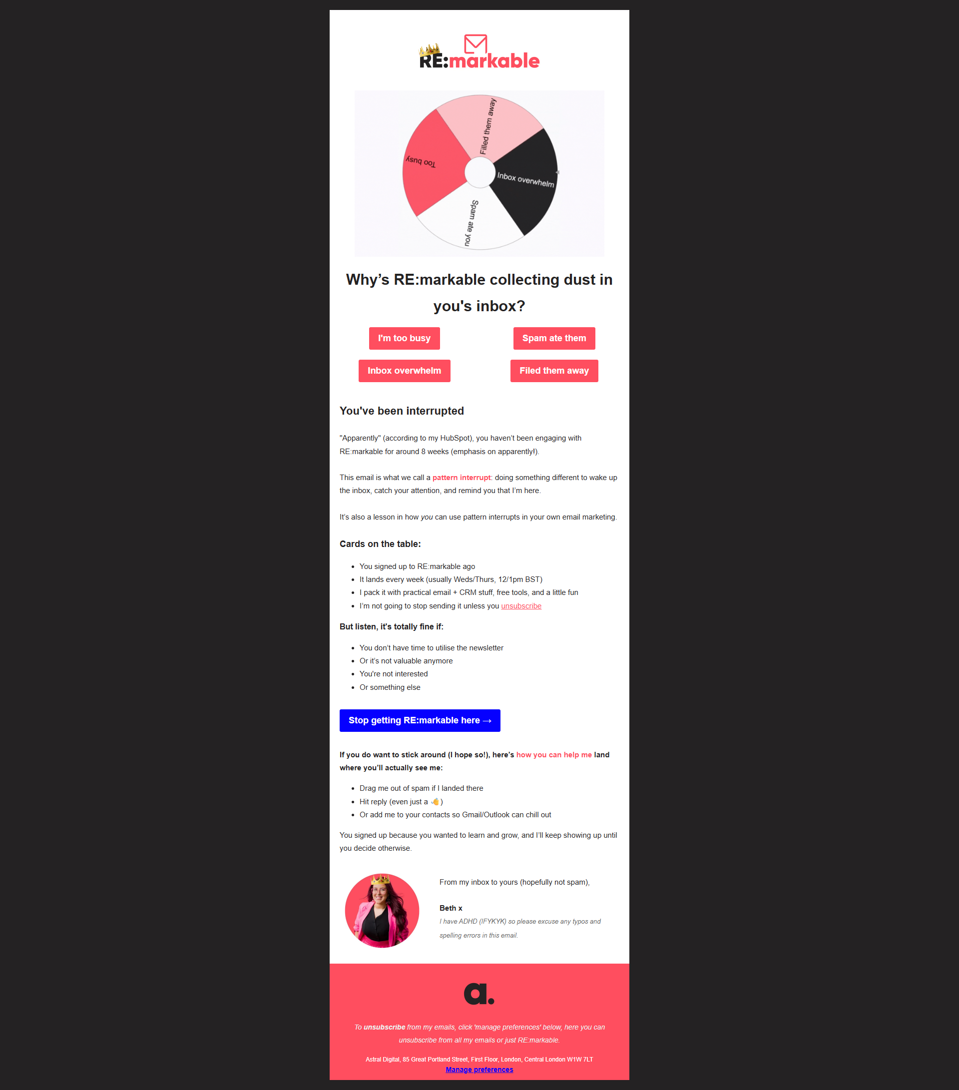 When I wanted to re-engage my cold segment, I changed my sender name to Queen of CRM and sent an email titled “Off with [first name]'s engagement!” complete with a spinning wheel GIF when you open the email.